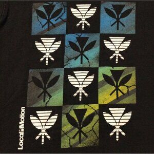 Black shortsleeved tee with distressed floral design graphics prints in ombré yellow green blue colors and words Local Motion on front. Front graphics print in great condition!