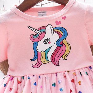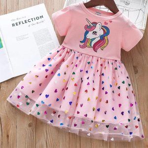 3T Girls Pink Blue Rainbow Unicorn Party Baby Dresses with Shiny Rainbow Hearts