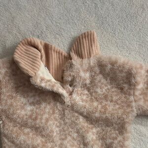 Elegant sweater with ribbed collar. Soft cream and tan hues. Perfect for layering.