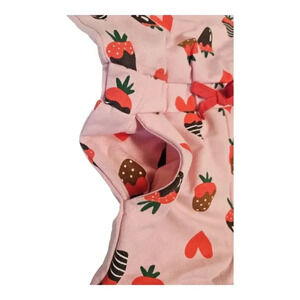 Cute pink with chocolate covered strawberry print, elastic on ankles and at waist, buttons in bank to ease getting on and off, super cute small ruffle sleeves that are short which makes it great for layering in the winter or light enough for warmer months. Versatile and adorable.