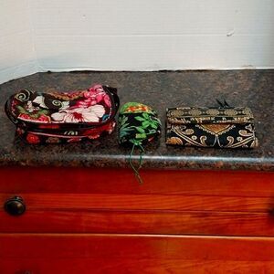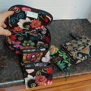 3 pieces include a black and brown multi compartment wallet, small jewelry keeper, and large multi compartment jewelry keeper.