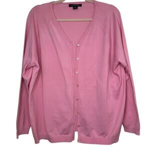 Add a pop of playful color to your wardrobe with this August Silk bubblegum pink cardigan sweater in a rare plus size 3X. Made from a luxurious silk blend (53% silk, 29% nylon, 18% viscose), this sweater has a soft, lightweight drape that’s perfect for layering year-round.
