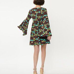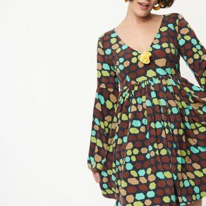 This dress is created with a smooth woven fabric featuring a geometric pattern. The colors are brown, pink, taupe and teal throughout the navy background. There is a removable yellow rose pin just beneath the v-neck. Sleeves are bell sleeves and the dress has a rear zipper closure and side pockets.