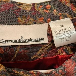 3X multicolor brocade-type jacket, red silky lining, mandarin collar, pretty buttons.