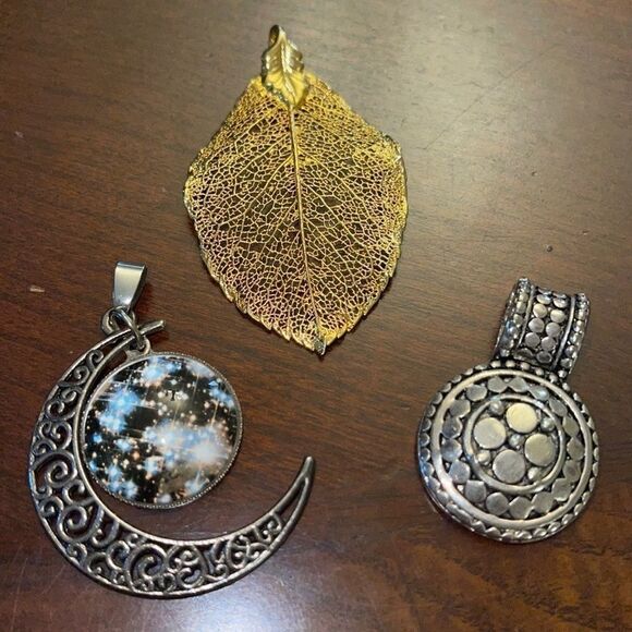 3 costume pendants silver tone moon, gold tone leaf and dotted silver tone circle. Please see pics for measurement details. No chains.