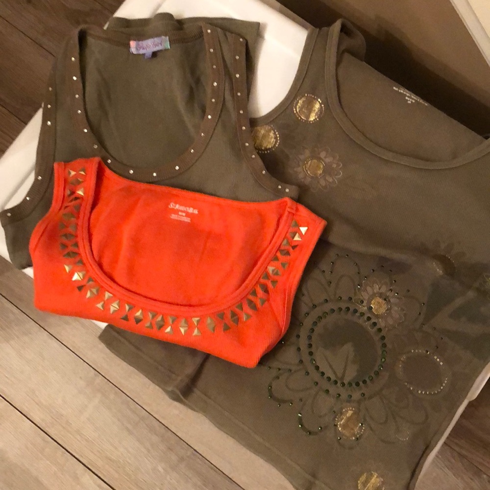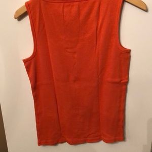 Orange tank w/ gold shapes around neckline is 100% Cotton made by St. John’s Bay.