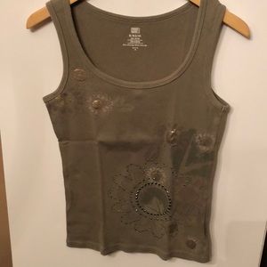 Army green tank with gold circles and blue turquoise gems is 100% Cotton made by Faded Glory.