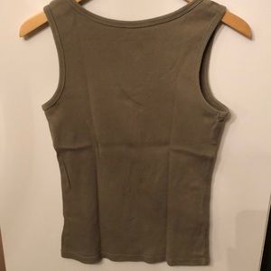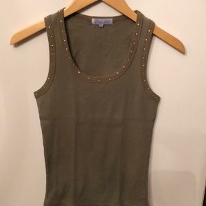 Army green tank w/diamonds around neckline & sleeves is cotton/polyester made by Pacific Girl.