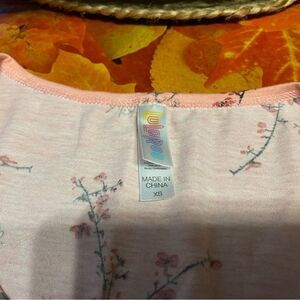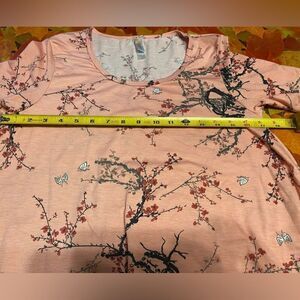 This is a like-new LuLaRoe long flared t-shirt, size XS. It’s a light pink with dark pink flowers, gray and black branches, and white/light gray butterflies. This is a really cute shirt. See chest measurement in the photos. No stains, snags or rips.