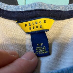 This is a really cute Prince & Fox long sleeved shirt, light blue sleeves with cream colored front and back, size S/P. Measurements are: pit to pit 16, stomach 16 and shoulder to bottom 22. It is in great used condition.