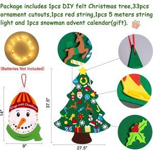 Package includes 1pcs DIY felt Christmas tree,33pcs ornament cutouts,1pcs string light,1pcs red string and 1pcs snowman advent calendar(gift).