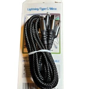 Experience efficient charging with the 3-in-1 Super Fast Charging Cable. Designed for versatility and speed, this black cable is perfect for all your devices.