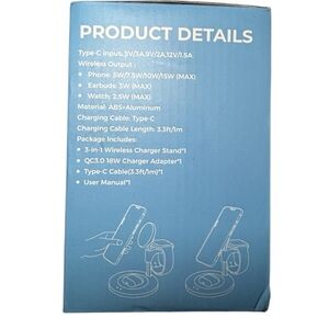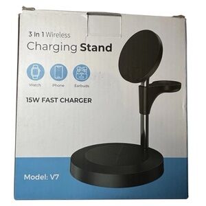Upgrade your charging setup with this 3-in-1 Wireless Charging Stand (Model V7). This sleek black stand allows you to charge your smartphone, smartwatch, and wireless earbuds all at once — eliminating messy cords and clutter. With 15W fast charging capability, it delivers a quick and efficient power boost for compatible devices. Perfect for desks, nightstands, or offices.