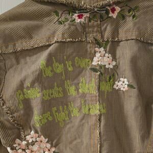 One of a kind boho blazer/jacket with stunning floral embroidery, patchwork details, and a quote stitched on the back. Frayed edges give it that perfectly lived-in, artsy vibe 🎨