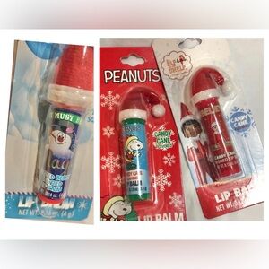 3pack Santa Hat topped Elf on the Shelf, Peanut’s Snoopy candy cane and Frosty the Snowman frosted berry flavored lip balms new