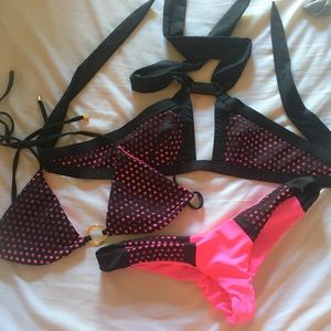 Selling all together only, please don't ask to separate! All pieces in new condition, the bottom did have the ruching come out, they still look great on though (or you can fix them) Both tops are medium and the bottoms are size Large