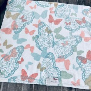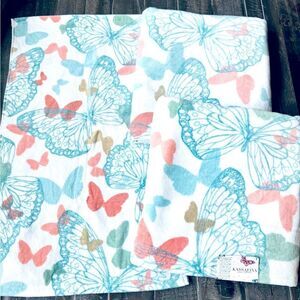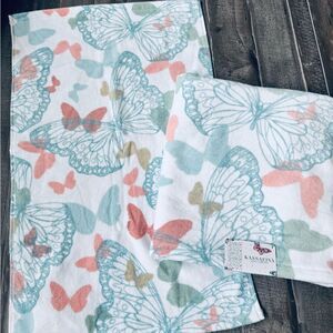 NWT 3-pc light pastel salmon pink, blue and sage green butterflies print bath towels set. Includes 2 large bath towels and one smaller hand towel. Perfect for spring and summer bathroom decor.