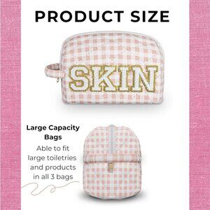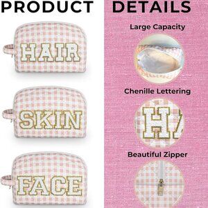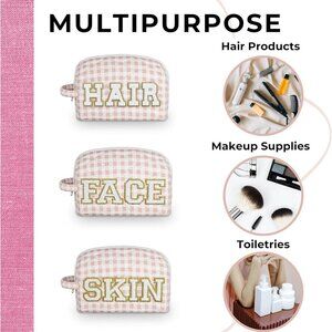 Versatile Set for Varied Needs: With three distinct bags, you're equipped for different requirements. Choose according to your routine - "Face" for cosmetics, "Hair" for haircare products, and "Skin" for skincare essentials. This set fulfills your daily organization needs.