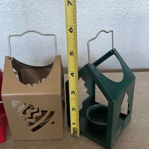 Set of 3 rustic Metal farmhouse red green and gold or tan hanging Tealight candle holders in great preowned condition. Minor signs of wear.