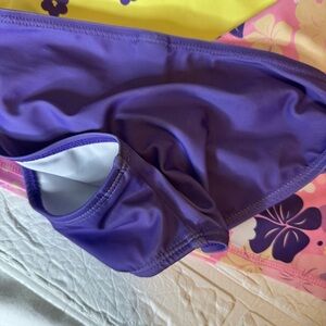 Brighten up swim time with this vibrant kids swim set. Featuring a playful floral design, this set includes a pink and purple floral rash guard, a yellow tankini top with purple flowers, and a solid purple bottom. Perfect for fun in the sun.