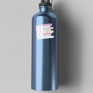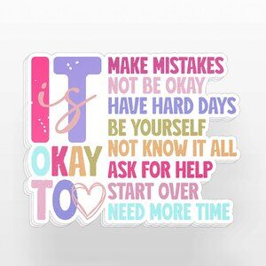Express self-compassion and embrace growth with this beautifully designed inspirational sticker featuring empowering messages in a vibrant color palette. The design combines playful typography with encouraging phrases like "Make Mistakes" and "Be Yourself" in a harmonious blend of pink, purple, mint, and gold tones, creating an uplifting visual reminder for daily motivation.