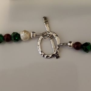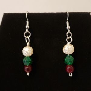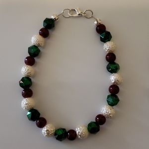 Handmade necklace, bracelet and earrings. Red, green and white glass beads with silver accents. Earrings dangle approximately 2 inches. Bracelet approximately 8 inches. Necklace 22 inches. From center of clasp to front center necklace 11 inches.