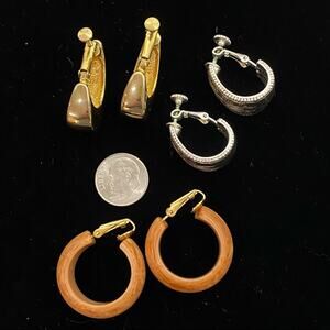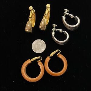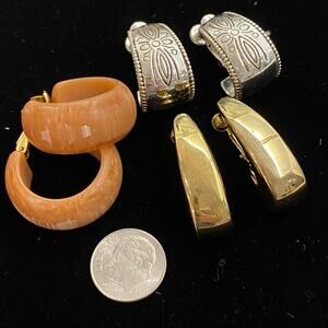 3 pc lot earrings. One is silver tone filigree. One is gold tone metal , the other are lightweight acrylic. All are clip on in hood preowned condition. No makers marks.