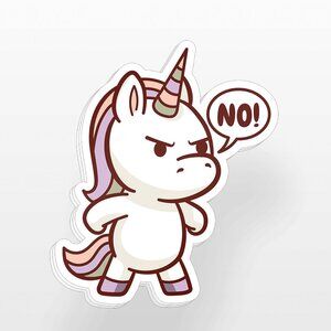 Express your assertive side with this adorable grumpy unicorn sticker featuring a determined "NO!" declaration. This charming vinyl sticker captures a minimalist white unicorn with an attitude, complete with expressive angry eyes and a distinctive horn, perfect for adding a touch of sass to your belongings.