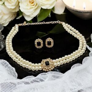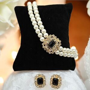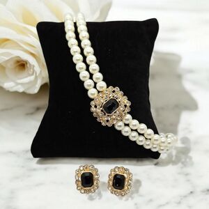 Design: double layer faux pearls, Rhinestone accents, faux onyx black gemstone