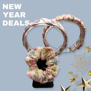 3pcs set includes 1 floral custom-made cotton/flannel scrunchie, 1 scrunchie floral headband, and 1 light blue Satin Headband with floral decor and pink hearts embellishments. This trendy trio will make a wonderful addition to your hair accessory collection. Perfect for ladies of all ages!! Perfect for Valentine's Day,Easter,and Mother's day!! All 3 pcs are made for comfort.