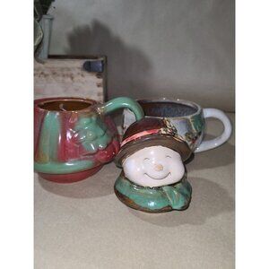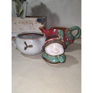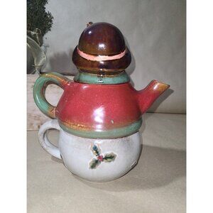 NWOB 3pc. snowman teapot & cup with no cracks, chips or repairs. Approximately 9"tall & 8" length