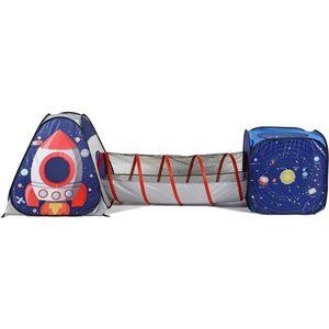 DESCRIPTION: 5, 4, 3, 2, 1 Blast Off! This space-themed tents and tunnel combo features great graphics and easily accommodates 3-4 children. Features multiple astronaut figures, the solar system, the planet, the rocket ship, and more.