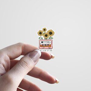 Express your musical spirit with this charming retro-inspired sticker featuring a pink cassette tape blooming with vibrant sunflowers and the thoughtful message "Trust in Vibes, Not Words." This artistic design combines vintage nostalgia with natural beauty, creating a unique statement piece for your favorite belongings.