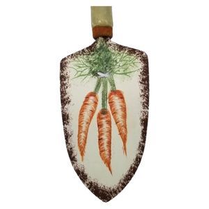 * 1 trowel designed with carrots the other corn - wood handles with metal hangers & metal bases