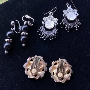 3pc lot Black enamel beaded Silver & Gold tone Clip & Drop dangle earrings bundle. They have a vintage feel but I don’t think they are old. No markings on any of them.