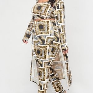 Crop top, straight leg pants and long cardigan