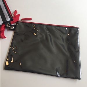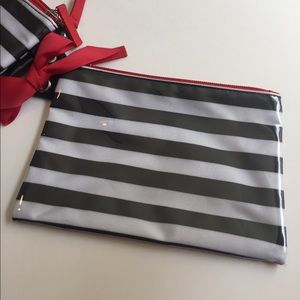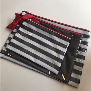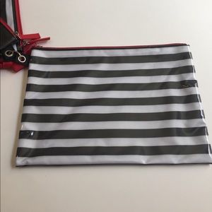 3-pc waterproof travel bags. Comes with 3 sizes with red zipper accents. The smallest and largest are striped and the medium one is black. Stays together with a hook and easily detachable. Great for make-up, toiletries, or even a clutch for the beach! New without tags, never used! Small- 7.5x5in. Medium- 8.5x6.5in. Large- 10.5x7.5in.