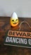 Set of candy corn decorations with a 'Beware of Dancing Goblins' sign. Perfect for Halloween.