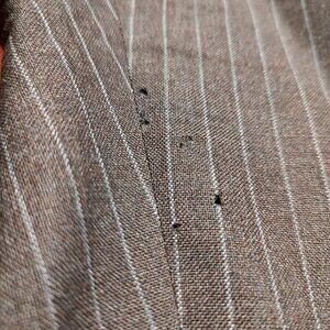 several moth holes in the pants and jacket (see pics) Should be an easy fix for any tailor or seamstress