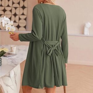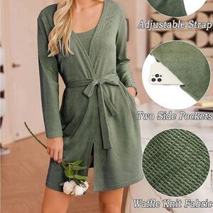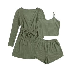 3 Piece Lounge Set - This women's waffle knit set consists of round neck crop top, elastic waist shorts, and a long open cardigan with pockets, great as indoor sleepwear or casual wear outfits.