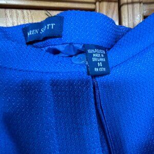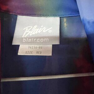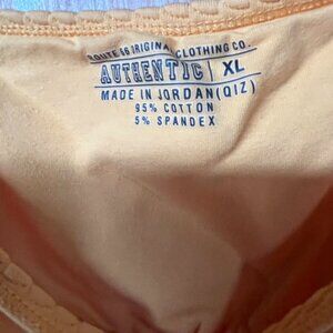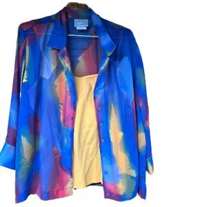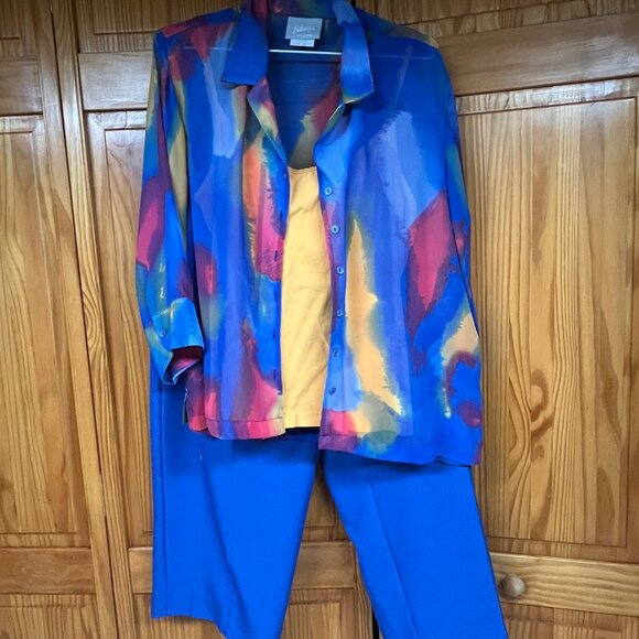 3-piece colorful bundle pant set. 14 Karen Scott dress blue pant, with front zipper. cropped, lined and back pockets XL Authentic Tank Top Yellow Orange and M Blair Multi color Blue Yellow Pink Sheer button shirt. Very sharp looking outfit. the pants are cropped and lined. Never worn