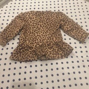 3-piece leopard pant set. Leopard peplum jacket, cream colored onesie with owl and lavender pants. Comes from a non-smoking and non-pet home.