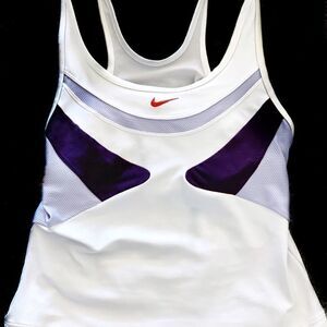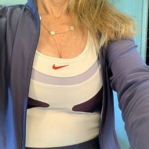 Very nice Nike 3 piece pants set in a. Soft plum color. Pants have straight legs with a notch at the bottom, comfy medium weight stretch fabric. Matching jacket has front zipper, pokers, and print and embroidered back. Tank top coordinates with pants and jacket.