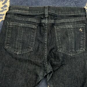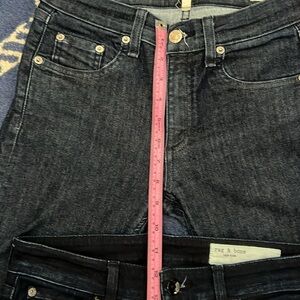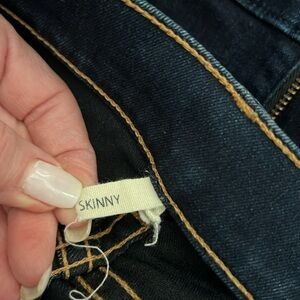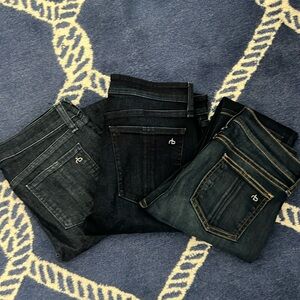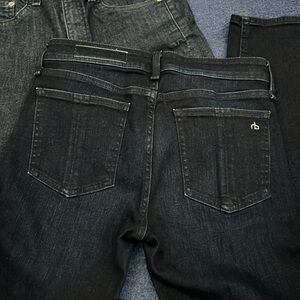 All three are skinny stretch, dark pair has front and back pockets, other two have faux front pockets for smooth fit, they have been dry cleaned , all three are in excellent condition, they are $189. Each Retail