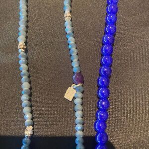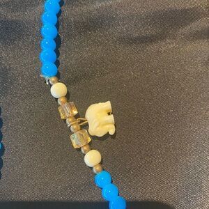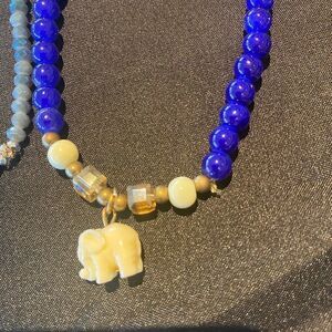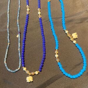 Three short beaded blue necklaces. Two of them have an elephant charm.