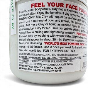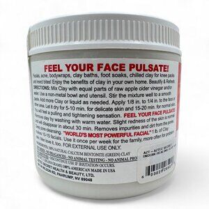 100% Natural Calcium Bentonite Clay. For facials, acne, bodywraps, clay baths, foot soaks, chilled clay for knee packs and insect bites. Removes impurities and dirt from the pores. Deep pore cleansing. 1 lb of clay makes 10-15 facials.