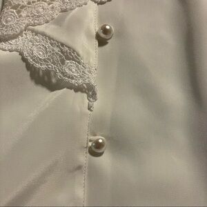 This blouse is in good condition with minimal signs of wear. It is 100% polyester and machine washable. This top is unique with the collar bib style neckline. It has little pearl buttons to enhance the appearance. This is just an overall classy looking blouse that would dress up any outfit.