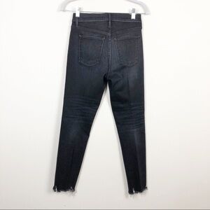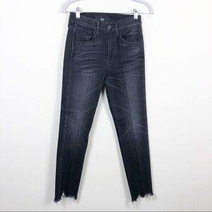 Slim straight leg, cropped inseam, frayed hem. Faded distressed black. High rise waist. Size 25. Cotton, elastane blend. Stretch.