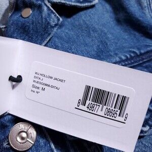 Women's 3x1 Hollow Denim jean jacket in "Dita" medium wash blue. Has silver grommets on the side and I believe it had side ties but they are not included. There is a very small mark on the inside of the collar and fading on the top of the collar. Style number WJESG0866. New with tags. Women's size M or medium, real measurements shown in photos with jacket laid flat: