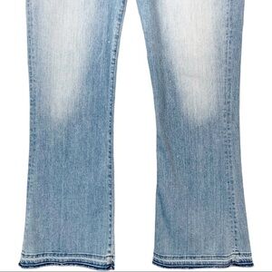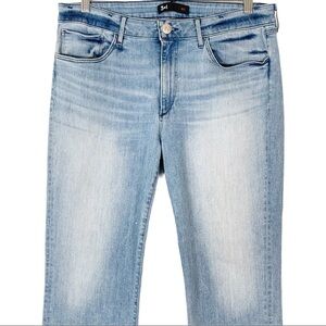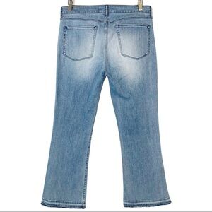 Gently pre-owned/like new 3x1 Midway Extreme Crop in the color Floyd Size 31. Features: Minimal stretch factory faded light wash denim fabric. Midrise fit. Slim fitting through the legs ascending to a cropped flare finish. Raw Bottom Hem. Zip to button closure.